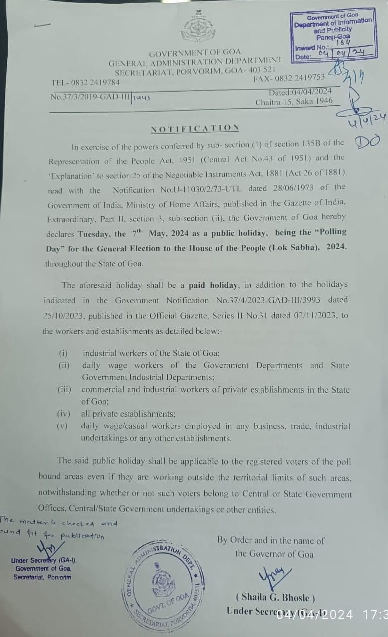 1 | Download | Declaration of paid holiday due to loksabha election-2024 in Goa | Admin | 2024-04-17 11:18:45 |